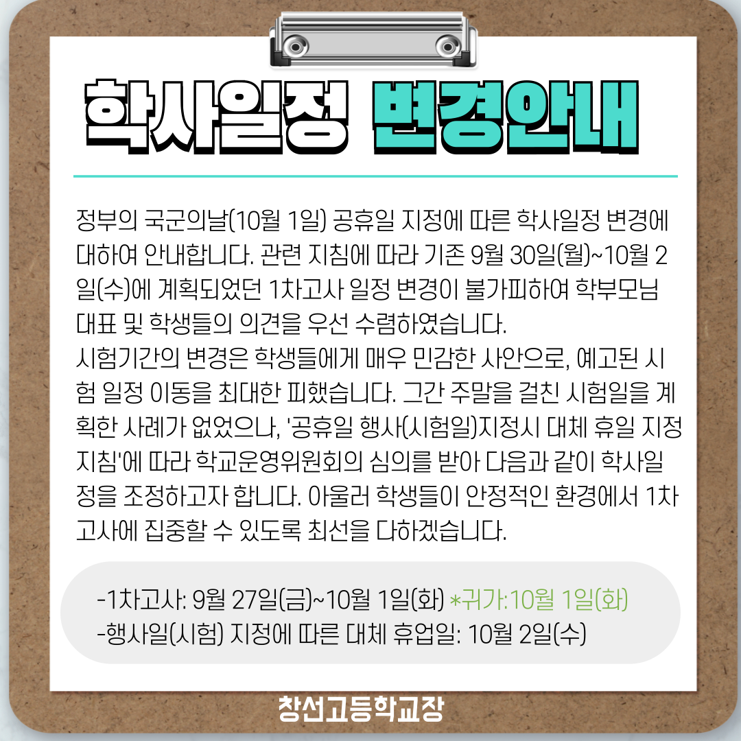 10월 대체공휴일 지정에 따른 학사일정 변경안내